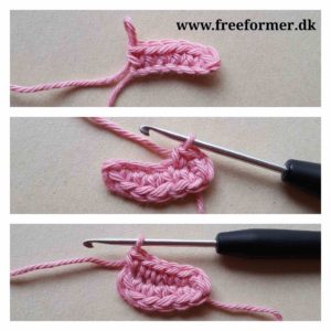 Start i 2. lm fra nålen. Hækl 6 fm på den ene side af lm’erne. Fortsæt på den anden side med 6 fm.