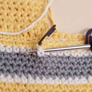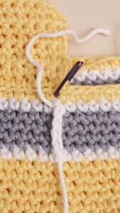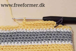 Rk 2-8 Start med gult garn. 1 fm i hver lm =70 fm