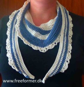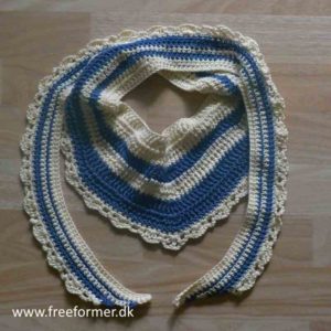 Begynd i 1. fm med 1 fm, *4 lm, spring 1 fm over, 1 fm i fm, 1 lm, spring 1 fm over, 1 stm, 1 lm, 1 stm, 1 lm, 1 stm i næste fm, 1 lm, spring 1 fm over, 1 fm i fm, * gent *-* 21 gange, spring 2 fm over, 1 stm, 3 lm, 1 stm, 3 lm, 1 stm i næste fm, 1 lm, spring 2 fm over, **1 fm i fm, 1 lm, spring 1 fm over, 1 stm, 1 lm, 1 stm, 1 lm, 1 stm i næste fm, 1 lm, spring 1 fm over, 1 fm i fm, 4 lm, spring 1 fm over **, gent **-** 21 gange, 4 lm, 1 fm, spring 1 fm over, 4 lm, 1 fm. Luk af